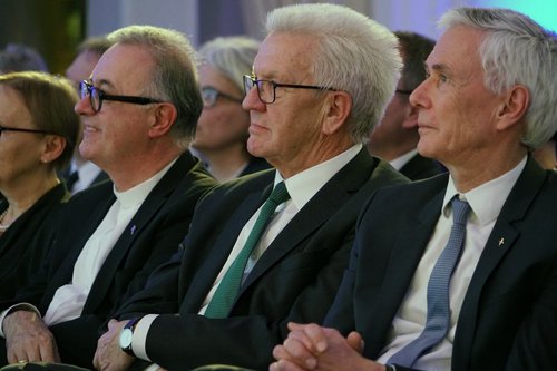 Edeltraut July, der württembergische Landesbischof Frank Otfried July, Ministerpräsident Winfried Kretschmann und der Landesbischof der evangelischen Landeskirche in Baden, Jochen Cornelius-Bundschuh (vlnr).