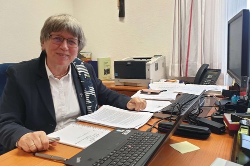 Inge Schneider in ihrem Büro im Oberkirchenrat: Zum letzten Mal bereitet sie derzeit gemeinsam mit den Mitarbeiterinnen der Synoden-Geschäftsstelle eine Tagung des Kirchenparlaments vor.