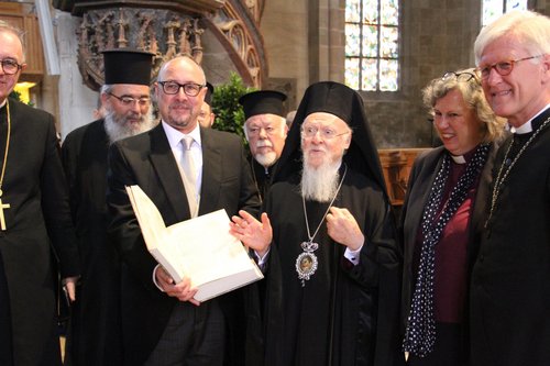 Patriarch Bartholomaios überreicht Professor Dr. Michael Tilly eine Faksimile-Ausgabe des griechischen Alten Testaments; mit Landesbischof Dr. h. c. Frank Otfried July (links) und dem EKD-Ratsvorsitzenden Heinrich Bedford-Strohm (rechts).