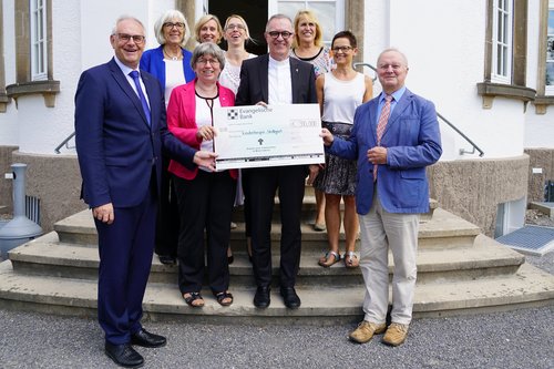 Landesbischof Dr. h. c. Frank Otfried July übergibt gemeinsame mit Synodalpräsidentin Inge Schneider einen Scheck in Höhe von 900.000 Euro.
