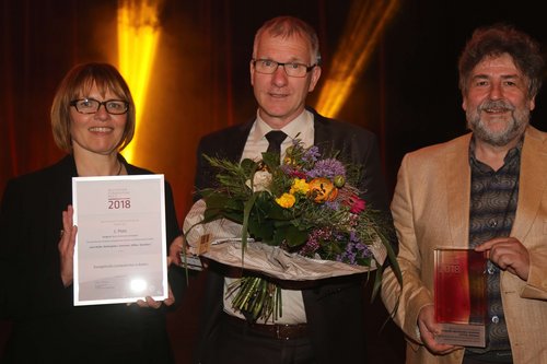 Katrin Stegmüller von der württembergischen Landeskirche (links) und Dr. Thorsten Sternberg von der badischen Landeskirche bei der Übergabe des Deutschen Fundraisingspreises.