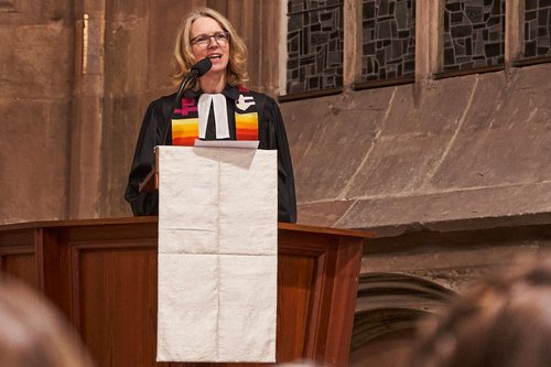 Pfarrerin Dr. Susan Durber, ÖRK-Präsidentin von Europa, bot den Teilnehmenden mit ihrem Vortrag einen narrativen Zugang zum historischen Kontext des Konzils von Nizäa, der durch heftige, teils sogar gewaltsame innerkirchliche Konflikte geprägt war. Sie machte deutlich, welche Gefahren die Konzilsteilnehmer damals auf sich nahmen, um am Konzil teilzunehmen und eine Einigung zu erzielen, und leitete daraus eine Verpflichtung der Kirchen heute ab, weiter auf ihre Einheit zuzugehen.