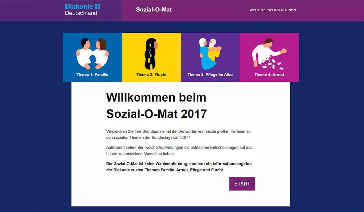 Der Sozial-O-Mat zeigt auf, welche Position zu ausgewählten sozialen Themen die einzelnen Parteien vertreten. Angelehnt an den Wahl-O-Mat müssen 12 Thesen aus den Themengebieten Familie, Flucht, Pflege und Armut mit "stimme zu", "stimme nicht zu", "neutral" oder "These überspringen" beantwortet werden. CDU/CSU, SPD, Bündnis 90/Die Grünen, Die Linke, FDP und AfD haben auf die gleiche Weise geantwortet. So können die Nutzer die eigenen Antworten mit denen der Parteien abgleichen und der Grad der Übereinstimmung wird errechnet. Beispielhafte Geschichten zeigen, welche Auswirkungen die verschiedenen politischen Ansätze zu den sozialen Themen für die betroffenen Menschen haben.