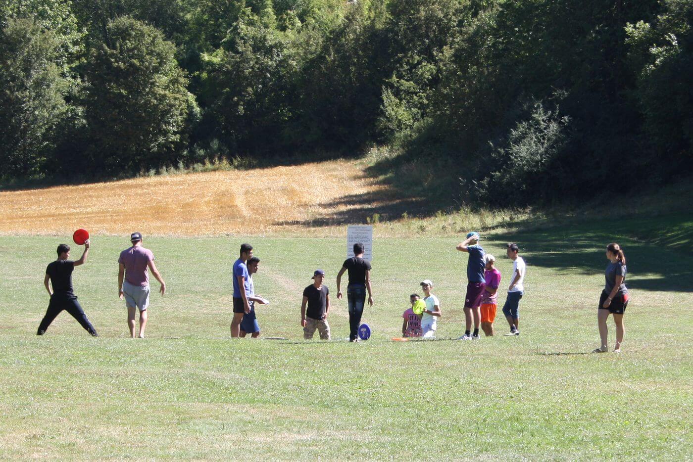 Frisbeescheiben fliegen durch die Luft. Grüne, blaue, rote, orangene. Nach ein paar Probewürfen erklärt Yasin Adigüzel den Jugendlichen auf dem Fußballplatz die Regeln für Discgolf. Mit der Frisbeescheibe sollen sie mit möglichst wenigen Würfen ein zuvor definiertes Ziel treffen, etwa das Tor auf der gegenüberliegenden Seite des Platzes. Adigüzel, der als Landesreferent des Evangelischen Jugendwerks (EJW) für „Interkulturelle Öffnung“ zuständig ist und „FreeStyle“ organisiert hat, spricht langsam, gestikuliert viel mit den Händen. Einige Jugendliche haben die Regeln dennoch nicht verstanden. Also nochmal auf Arabisch. Ein junger Mann übersetzt in Farsi. Und endlich geht es los.