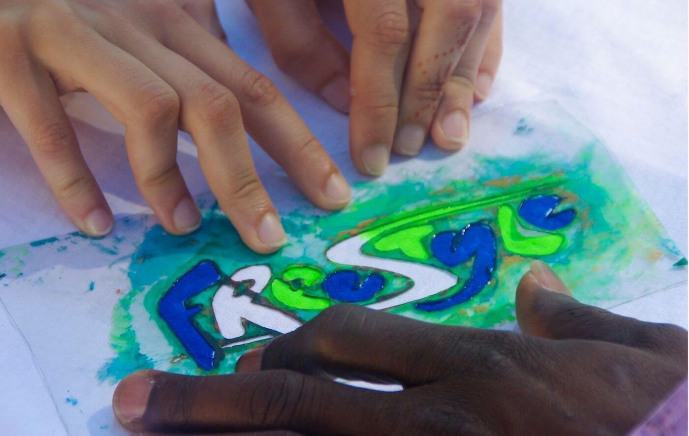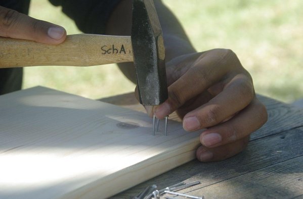 Zum Mitmachen gibt es viel. An diesem Vormittag sind es sieben verschiedene Workshops. Die Jugendlichen können nicht nur Discgolf spielen, sondern auch T-Shirts bedrucken oder den Kletterturm bezwingen. Einige sind unterwegs beim Geocachen, eine kleine Gruppe lernt ein paar Akkorde auf der Gitarre. Wieder andere beschäftigen sich gemeinsam mit Geschicklichkeitsspielen. Beim Nagelworkshop sitzen die Jugendlichen im Schatten an einem Biertisch und hauen hunderte Nägel in Bretter. So entstehen die Worte „Love“ und „Frieden“.