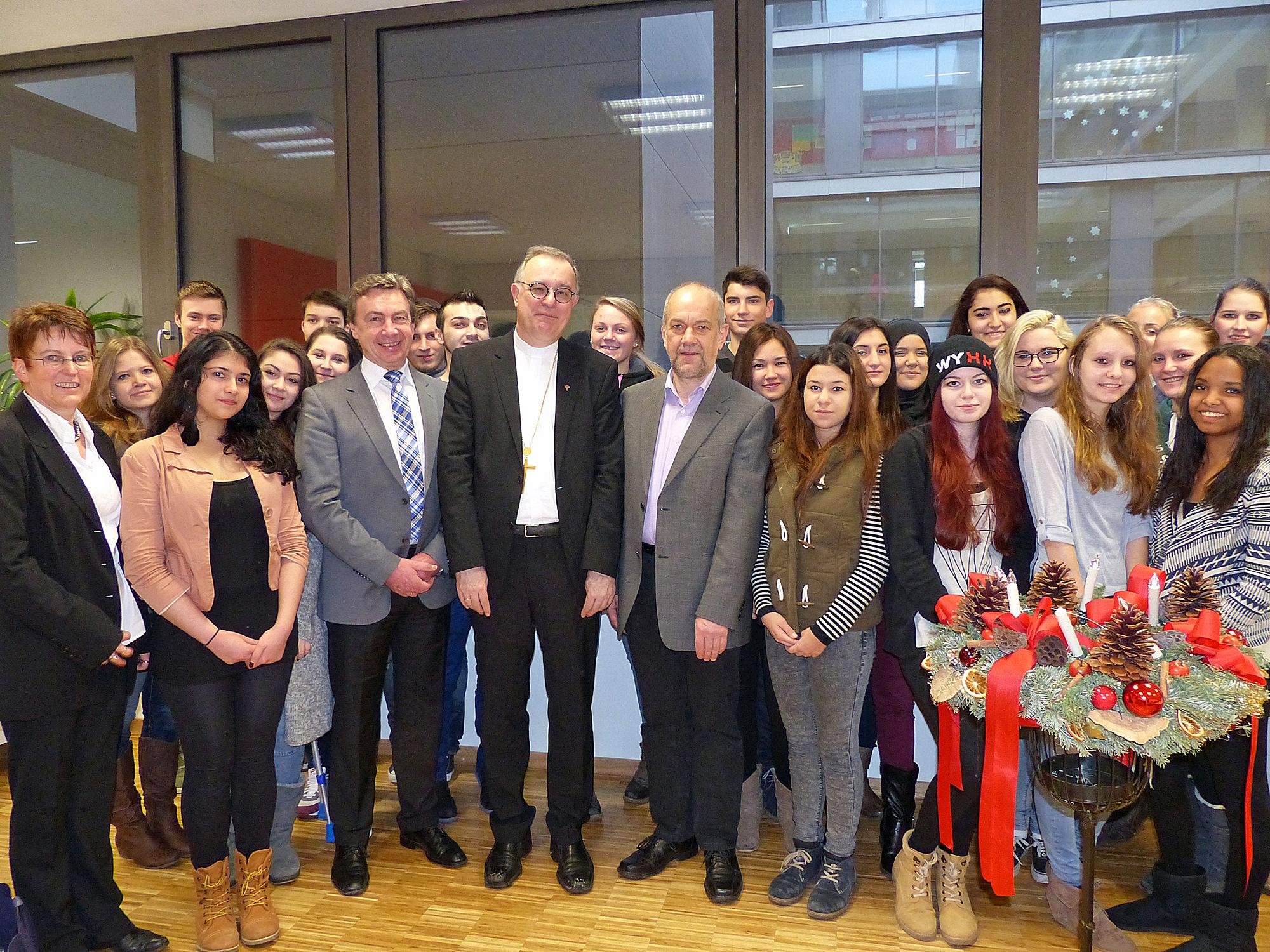 Schulleiter Dieter Göggel (Hedwig-Dohm-Schule) und sein Kollege Anton Metz (Alexander-Fleming-Schule) zeigten Landesbischof July danach das neue Berufsschulzentrum mit rund 2.400 Schülern und 170 Lehrern, in dem etwa Erzieher, Zahntechniker, Hauswirtschafter und Medizinische Fachangestellte ausgebildet werden. July äußerte sich beeindruckt: „Sie können sich nicht nur über ein schönes und großzügiges Gebäude mit hervorragender Ausstattung freuen, sondern füllen es mit Leben und vermitteln jungen Menschen eine gute Grundlage für das Berufsleben. Besonders freue ich mich darüber, dass Sie Bildung im umfassenden Sinn betrachten und dass dazu auch ein Schulgottesdienst zu Weihnachten gehört. Das christliche Menschenbild ist Fundament der Bildungsarbeit in unserem Land, deshalb sind Schulgottesdienste gut und wichtig.“