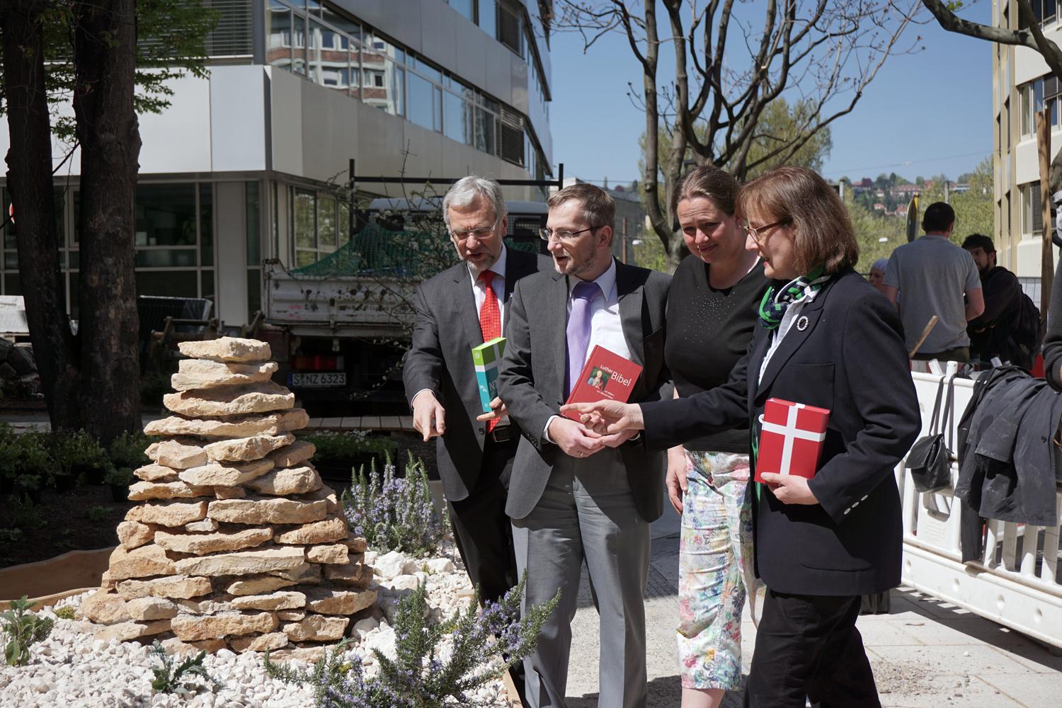 Stuttgart. Am 13. Mai wird das „bibliorama – das bibelmuseum Stuttgart“ eröffnet. Erste „Station“ der künftigen Ausstellung ist „Evas Paradiesgarten“, ein nach den Gesichtspunkten der Permakultur konzipierter symbolischer Drei-Zonen-Garten. Dieser wurde am heutigen Freitag angepflanzt und bei einem Bildtermin der Presse vorgestellt. Aus diesem Anlass gab die Kuratorin des Bibelmuseums Dr. Susanne Claußen auch schon erste Einblicke in das künftige „bibliorama“: „Das neue Bibelmuseum ist ein Mitmachmuseum. Es kann mit allen Sinnen erlebt werden. Dabei gehen wir auf den Inhalt der Bibel ein, aber auch auf ihre Entstehungs- und Wirkungsgeschichte.“