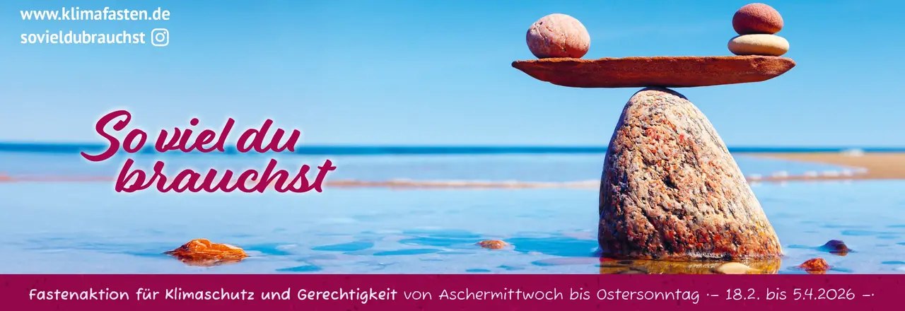 Mit der ökumenischen Fastenaktion „Klimafasten 2026 – So viel du brauchst“ vom 18. Februar bis 5. April 2026 laden wir Sie dazu ein, gemeinsam zu entdecken, wie ein Leben gelingen kann, das unsere natürlichen Ressourcen nicht überstrapaziert und die Erderhitzung nicht weiter beschleunigt – und das gleichzeitig nicht eng oder kleinlich ist, sondern die Fülle feiert, von der Jesus spricht: „Ich bin gekommen, damit sie das Leben haben und volle Genüge“ (Johannes 10,10). Wie können wir so leben, dass wir achtsam mit dem umgehen, was uns zur Verfügung steht, und dennoch die Fülle des Lebens genießen? Genau dazu möchte das Klimafasten Impulse geben.