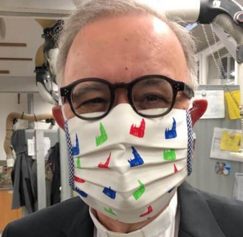 Bestens gerüstet für die neuen Corona-Vorgaben: Landesbischof Dr. h. c. Frank Otfried July kann sich künftig beim Einkaufen und in öffentlichen Verkehrsmitteln mit einer Ulmer-Münster-Maske schmücken. Mittwochmorgen ist ihm der außergewöhnliche Mundschutz überreicht worden.