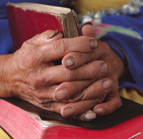 Bibel-Bildern aus den USA stellt LBW-Generalsekretär Martin Junge dieses Bild gegenüber: eine vielgelesene Bibel in Händen einer Frau, die harte Arbeit kennt. Landesbischof Dr. h. c. Frank Otfried July unterstützt die Botschaft, die Junge mit dem Bild verbindet.