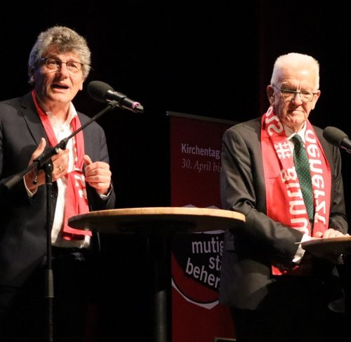 Landesbischof Gohl und Ministerpräsident Kretschmann haben beim Kirchentag in Hannover eine gemeinsame Bibelarbeit zu Markus 7,24-30 gestaltet. Sie zogen anhand der Bibelstelle verschiedene Analogien und Lehren zur Gegenwart in Bezug auf soziale Gerechtigkeit sowie Debattenkultur und Populismus und Umgang mit psychischen Erkrankungen.